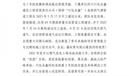 2024年11月21日,四川能投建工集团有限公司收到来自四川能投广元燃机发电有限公司的一封感谢信,并荣获“建设功勋单位”荣誉。在感谢信中,四川能投广元燃机发电有限公司对四川能投建工集团...